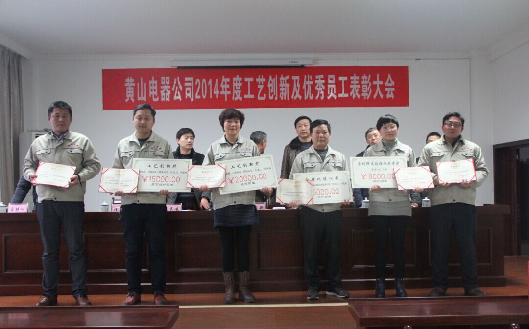 2014年3月4日上午黃山電器公司在四樓會議室召開了“2014年度工藝創(chuàng)新暨優(yōu)秀員工表彰大會”,并邀請縣經(jīng)信委領(lǐng)導(dǎo)汪光輝參加。會上,汪杏娟、鄭春鳴同志分別獲得了“2014年度工藝創(chuàng)新獎”,葉民強同志獲得了“2014年度合理化建議獎”,王納同志獲得了“原材料采購降低成本獎”。同時芯片一部擴散、腐
